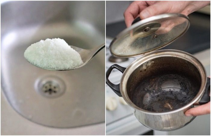 Как только вы заметили, что кастрюля или сковорода пригорели, сразу замочите и оставьте на пару часов. После этого слейте воду и засыпьте загрязненные участки толстым слоем соли. Оставьте еще на два-три часа, а потом почистите посуду губкой. Если не сработало, сделайте раствор. Налейте в грязную посуду 800 мл воды, добавьте 8 столовых ложек соли, хорошо перемешайте и оставьте на ночь. Утром поставьте кастрюлю на плиту и кипятите около 30 минут. Остывший раствор слейте, а размягченный нагар удалите губкой. Обратите внимание, что оба эти способа не подходят для изделий из нержавеющей стали, так как соль может ее поцарапать.