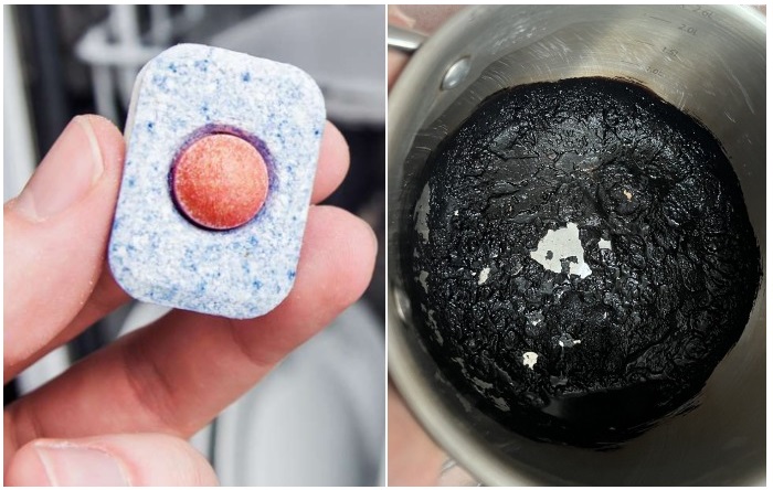 • Вместо губки. Этот метод идеально подойдет в том случае, если вы торопитесь и у вас нет времени замачивать или долго чистить посуду. Возьмите таблетку для посудомойки и пройдитесь ею по загрязненным участкам. Полируйте стенки и дно до тех пор, пока от остатков пищи не останется даже следа. Обратите внимание, что для такого способа чистки нужна именно таблетка с порошкообразной текстурой, а не капсула с гелем.