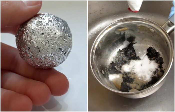 Итак, для начала насыпьте в скороду или кастрюлю соду, чтобы она полностью покрыла дно. Далее добавьте несколько столовых ложек воды, чтобы получилась паста. Оторвите кусочек пищевой фольги, сомните в шарик и трите загрязнения, пока они не исчезнут. Пожалуй, единственный минус этого метода состоит в том, что вам придется действовать вслепую – из-за толстого слоя соды будет непонятно, где еще осталась пригоревшая пища.