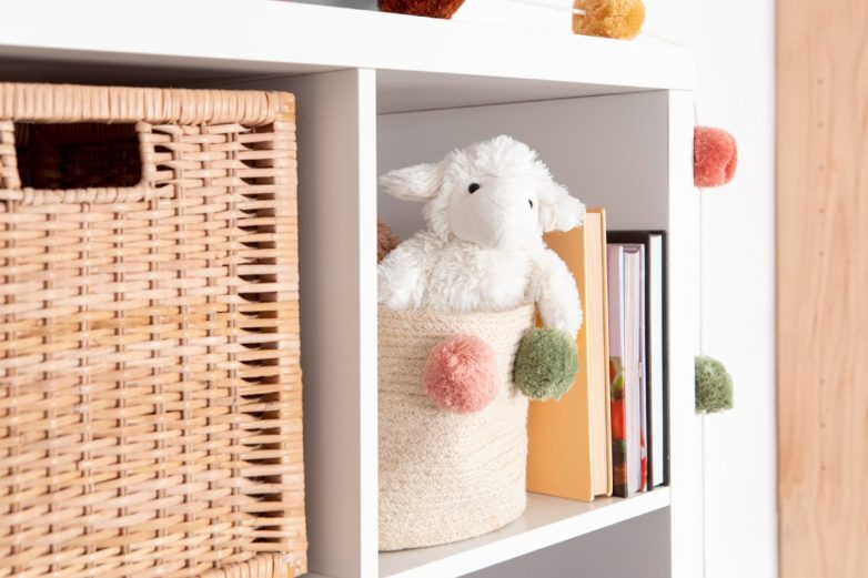 В каждой детской нужен контейнер «быстрого сбора». Это одна большая корзина или ящик, куда вечером можно оперативно сложить все разбросанное.Позже вещи распределяются по местам. Такой прием спасает в будни и не дает хаосу закрепиться.