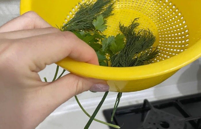Листья зелени являются универсальным украшением любого горячего блюда. Многие знаменитые повара до сих пор так украшают свои кулинарные шедевры. А чтобы быстрее отделить листья от стеблей, стоит воспользоваться нашим советом. Просто отправьте зелень в дуршлаг и протягивайте стебельки сквозь отверстия. Так вы достанете все стебли, а заветные листья для украшения останутся внутри. Это позволит вам быстро и легко отделить листья от основания.