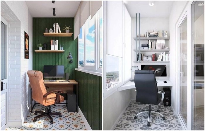 В этом плане кабинет на лоджии – идеальный вариант. Здесь светло, тихо, спокойно, никто не мешает заниматься рабочими вопросами. А во время перерыва можно заварить кофе и несколько минут полюбоваться видом из окна. В случае с кабинетом планировка комнаты обычно выглядит следующим образом: по одной стене – стол со стулом, по другой – система хранения, например, узкий шкаф или стеллаж.