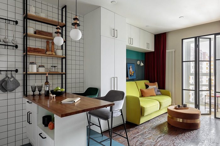 Еще один беспроигрышный вариант для зонирования, который часто используют в студиях – барная стойка. Она не только отделяет кухню от остальной части квартиры, но также служит удобной обеденной зоной. Это прекрасный вариант для двоих – можно попить кофе, позавтракать и даже поработать, если единственный письменный стол в квартире занят.