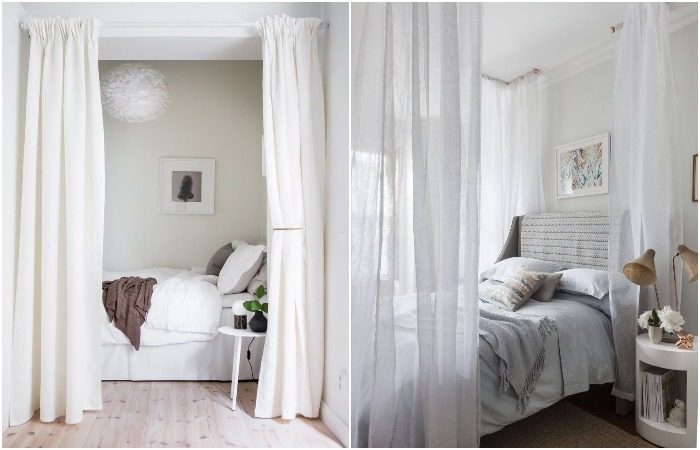 Нуждаетесь в «мобильных» перегородках, которые могут исчезать или появляться при необходимости? Тогда шторы станут прекрасным решением. Чаще всего их используют для того, чтобы скрыть спальное место от посторонних глаз. Можно повесить легкие, полупрозрачные занавески, а можно – плотные шторы, надежно защищающие от света. В первом случае вы лишь обозначите границу спальни, а во втором – обеспечите себе максимальное уединение и приватность.