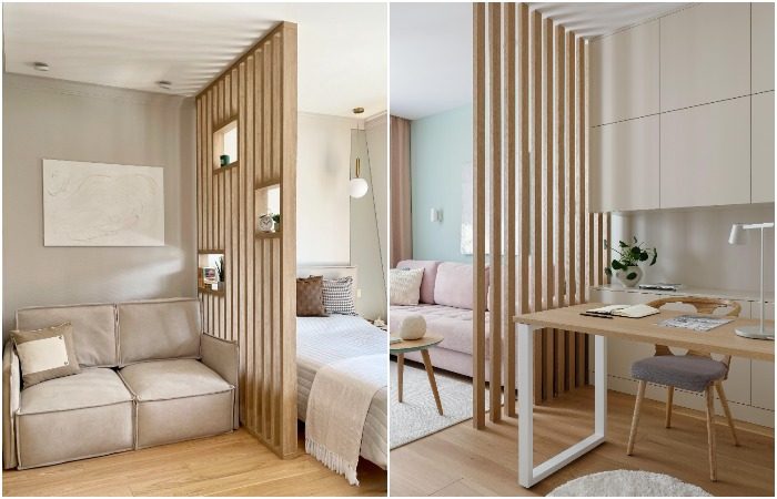 Несмотря на то, что такие рейки уже утратили свою актуальность, вряд ли кто-то будет спорить, что с их помощью можно эффективно разделить пространство. Установите их между спальней и гостиной, но в укороченном варианте – чуть больше глубины дивана. Таким образом интерьер получит смысловое разделение, но при этом будет оставаться легким и воздушным.