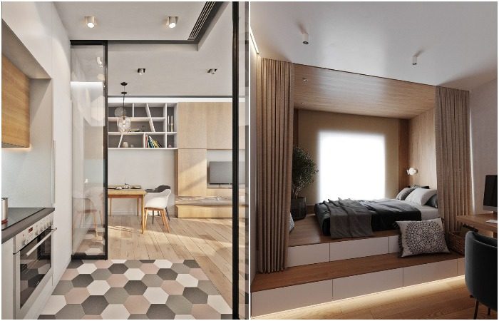 Разный уровень пола тоже поможет разделить студию на зоны. На подиуме высотой 30-40 см будет отлично смотреться кровать. Вот так вы сможете организовать отдельную спальную зону, вместо того, чтобы ютиться на диване. А если предусмотреть в подиуме ящики, то получится сделать еще и вместительную систему хранения.