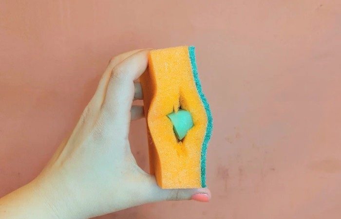 Возьмите форму для льда и залейте в нее средство для мытья посуды. Отправьте форму в морозилку до полной заморозки. Обычно хватает пары часов. После чего сделайте небольшой продольный надрез на вашей губке и поместите туда один кубик. Этого хватит, чтобы перемыть всю посуду. Так вы точно сможете контролировать расход средства для мытья посуды.