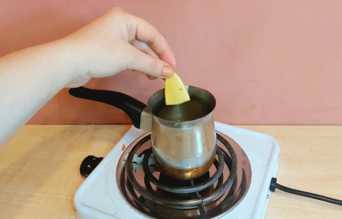 Просто поместите в турку пару лимонных ломтиков и залейте водой, после чего отправьте ее на огонь и оставьте до полного закипания. Далее необходимо слить воду и протереть турку изнутри чистой губкой. Нагар исчезнет сам по себе.