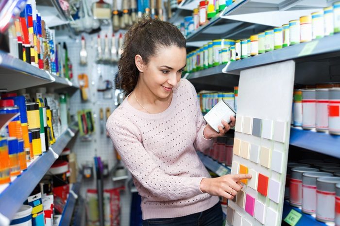 Девушка выбирает цвет краски для стен.