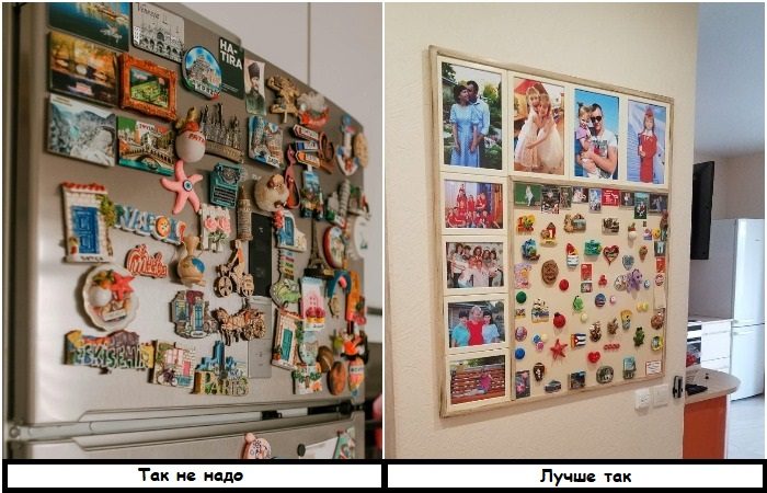 Речь идет не обо всем декоре, а только о том, который портит интерьер и создает визуальный шум. Яркий пример – магнитики на холодильнике. Как только вы их уберете, то сразу заметите, что кухня стала выглядеть легче и просторнее. Пыльные статуэтки на полках, рамки с фотографиями на всех столах и тумбах в квартире, пустые вазы – все это захламляет квартиру.
