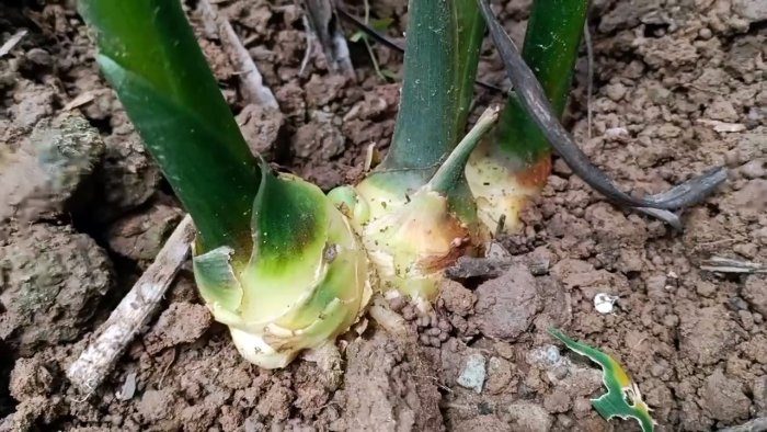 Когда растение достигнет высоты около одного метра, уберите сухостой с грядок. На открытые участки корней подсыпьте землю, удалите сорняки и между растениями снова разложите сухие ветки. Обильно полейте имбирь водой.