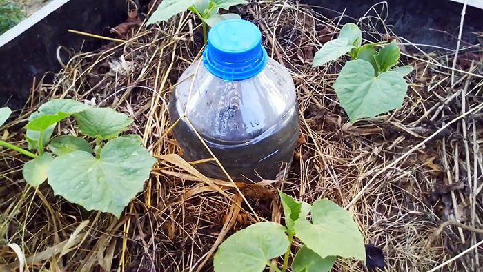 Определившись с диаметром отверстий можно подготовить необходимое количество однотипных проколотых бутылей, и вкопать их в грядки. Глубина закапывания при этом зависит от уровня залегания корней растений. Для огурцов оптимально заглублять емкость на 1/3 высоты, а для помидор на 2/3. Бутыли лучше закапывать сразу с водой, чтобы они не деформировались.