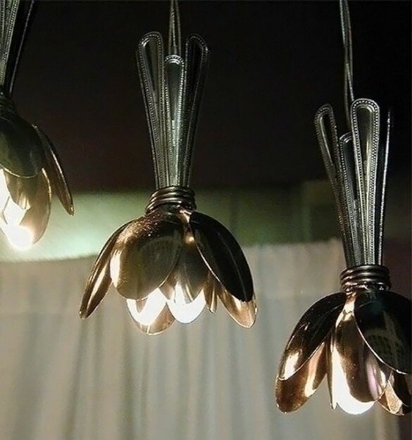 Благодаря своим составляющим она будет отбрасывать интересные тени на стены, а также и издавать звуки при малейшем сквозняке, настоящая музыка ветра. Если же выполнить люстру только из ложек, то она скорее будет смотреться наиболее романтично. Словно это и не ложки вовсе, а специально выкованные металлические тюльпаны.